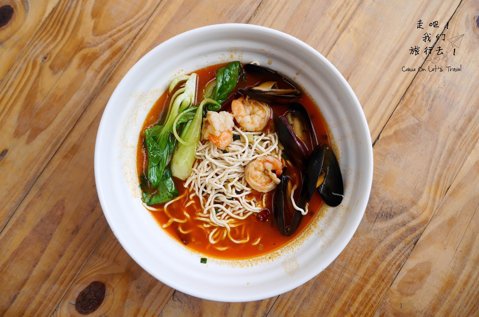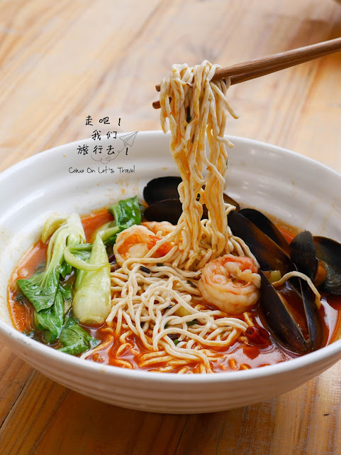 即将推出的超特别创意面食,厨师先把面条炒过,再加上浓浓的海鲜汤,一道充满各种新鲜海鲜的海鲜汤面就出场了!汤汁带辣,而且稍微有点糊状,有点不太习惯这样的面食。